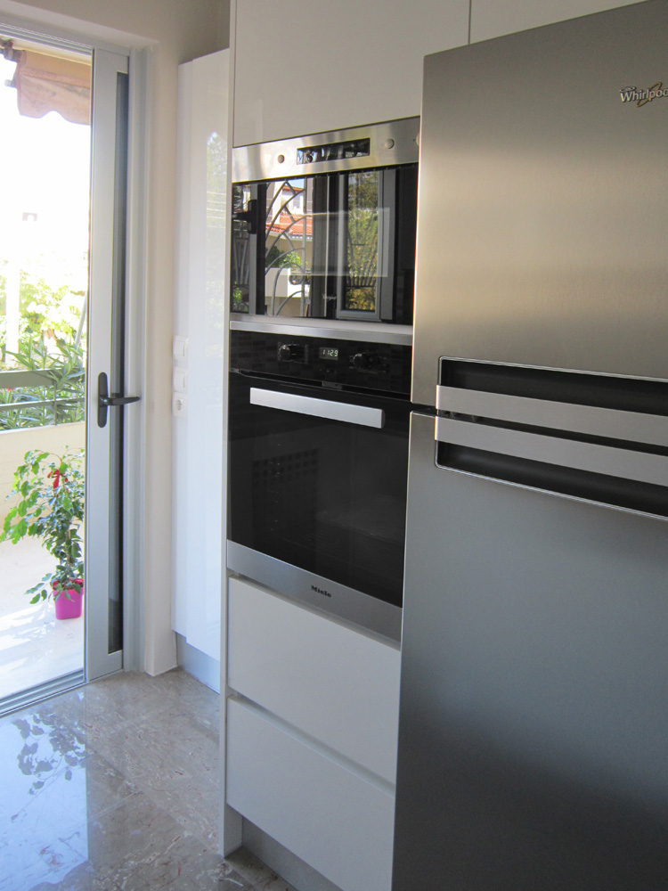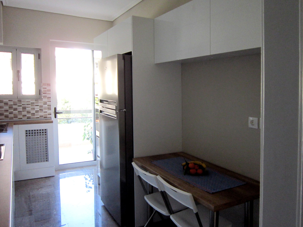 Μας ζητήθηκε η πλήρης ανακαίνιση ενός διαμερίσματος 75 περίπου τετραγωνικών στο Χαλάνδρι. Έγινε πλήρης αντικατάσταση της εγκατάστασης ύδρευσης και αποχέτευσης ενώ τροποποιήθηκε αισθητά και η ηλεκτρολογική εγκατάσταση ώστε να ικανοποιεί τις ανάγκες των ιδιοκτητών. Κατασκευάστηκε και τοποθετήθηκε νέα κουζίνα από λευκό γυαλιστερό βακελίτη και έγινε πλήρης αναμόρφωση και ανακατασκευή του μπάνιου και του WC. Τα μάρμαρα και τα ξύλινα δάπεδα συντηρήθηκαν και τα κουφώματα αντικαταστάθηκαν μέ καινούρια. Επίσης συντηρήθηκαν - επισκευάστηκαν όλες οι παλιές πόρτες και οι ντουλάπες. Η δυσκολία του συγκεκριμένου έργου ήταν το μικρό χρονικό διάστημα που είχαμε στην διάθεσή μας. Τελικά όμως το έργο παραδόθηκε με επιτυχία σε μόλις ένα μήνα.